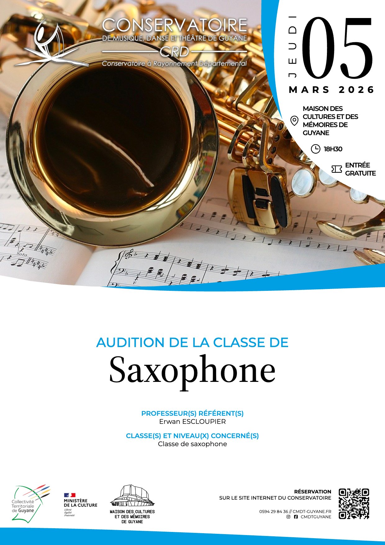 Home Évènements Audition de la classe de saxophone Audition de la classe de saxophone PROFESSEUR(S) RÉFÉRENT(S) Erwan ESCLOUPIER CLASSE(S) ET NIVEAU(X) CONCERNÉ(S) Classe de saxophone Billetterie Weezevent 00 jours 00 heures 00 minutes 00 secondes Date Mar 05 2026 Heure 18 h 30 min Tarif Gratuit Lieu Maison des Cultures et des Mémoires de Guyane - MCMG Organisateur Conservatoire de Musique Danse et Théâtre Guyane Téléphone 0594298436 Email communication@cmdt-guyane.fr Site Web https://cmdt-guyane.fr/ Autres organisateurs Collectivité Territoriale de Guyane Site Web https://www.ctguyane.fr/ Direction des affaires culturelles Site Web https://www.service-public.fr Partagez cet événement