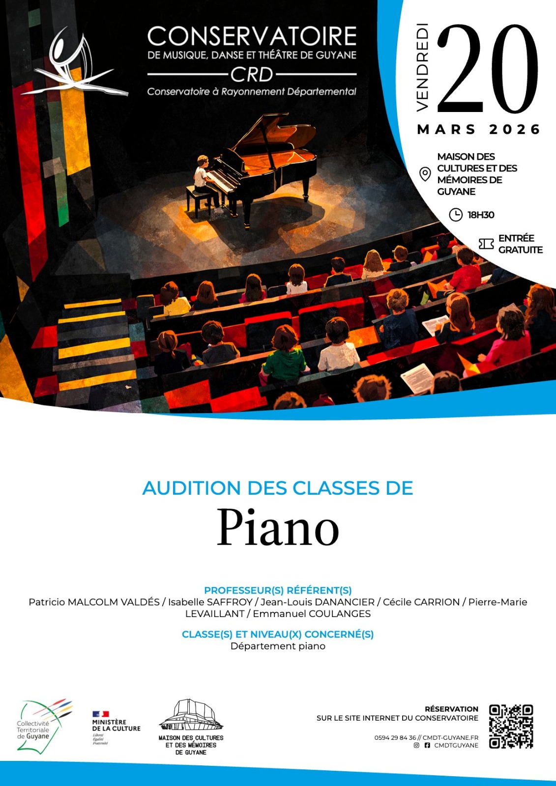 Home Évènements Audition de piano Audition de piano Billetterie Weezevent Date Mar 20 2026 Expired! Heure 18 h 30 min Tarif Gratuit Lieu Maison des Cultures et des Mémoires de Guyane - MCMG Organisateur Conservatoire de Musique Danse et Théâtre Guyane Téléphone 0594298436 Email communication@cmdt-guyane.fr Site Web https://cmdt-guyane.fr/ Autres organisateurs Collectivité Territoriale de Guyane Site Web https://www.ctguyane.fr/ Direction des affaires culturelles Site Web https://www.service-public.fr Partagez cet événement