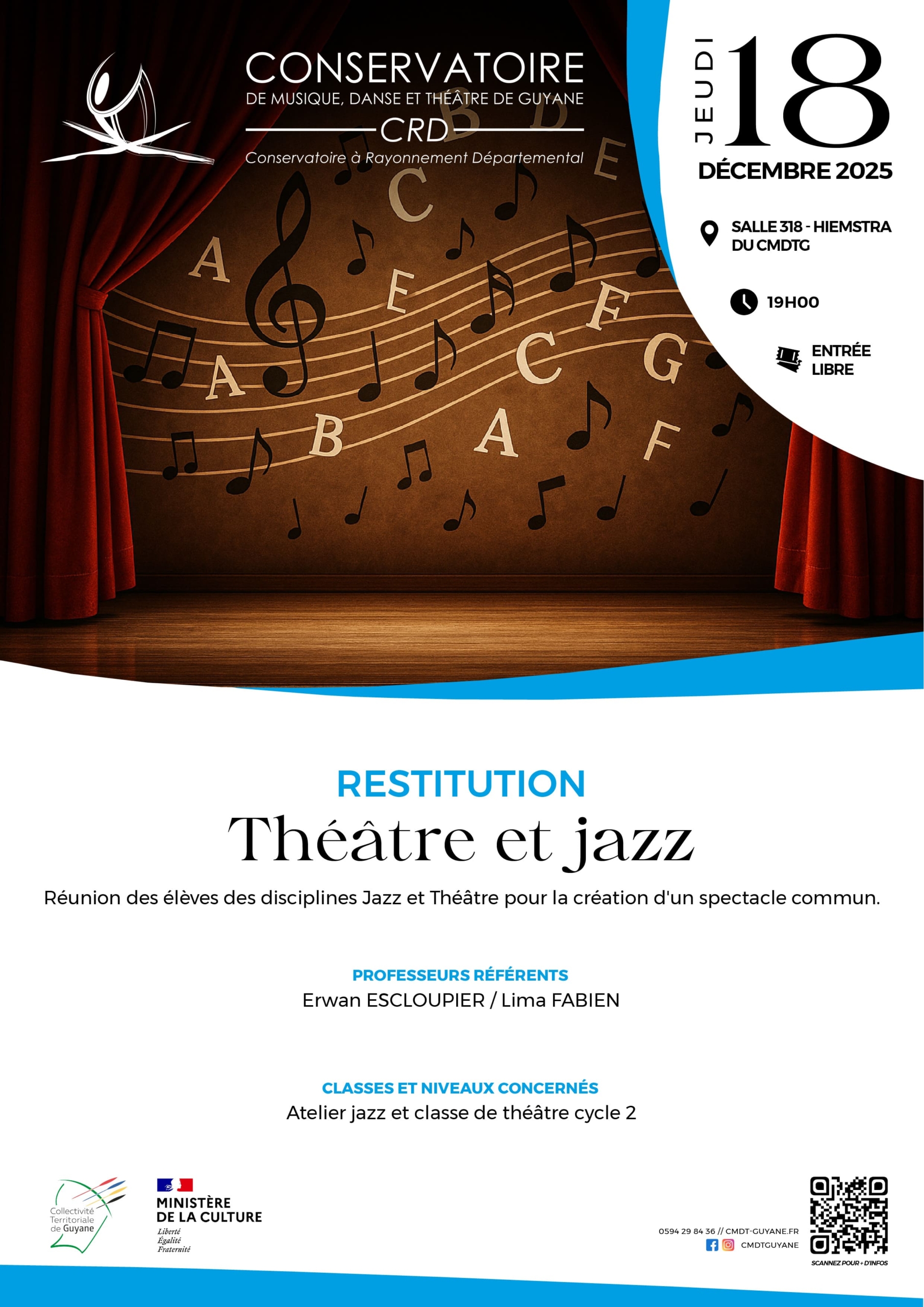 Home Évènements Théâtre et jazz Théâtre et jazz Réunion des élèves des disciplines Jazz et Théâtre pour la création d’un spectacle commun. PROFESSEURS RÉFÉRENTS Erwan ESCLOUPIER / Lima FABIEN CLASSES ET NIVEAUX CONCERNÉS Atelier jazz et classe de théâtre cycle 2 00 jours 00 heures 00 minutes 00 secondes Date Déc 18 2025 Heure 19 h 00 min Tarif Gratuit Lieu Salle 318 - HIEMSTRA Organisateur Conservatoire de Musique Danse et Théâtre Guyane Téléphone 0594298436 Email communication@cmdt-guyane.fr Site Web https://cmdt-guyane.fr/ Autres organisateurs Collectivité Territoriale de Guyane Site Web https://www.ctguyane.fr/ Direction des affaires culturelles Site Web https://www.service-public.fr Partagez cet événement